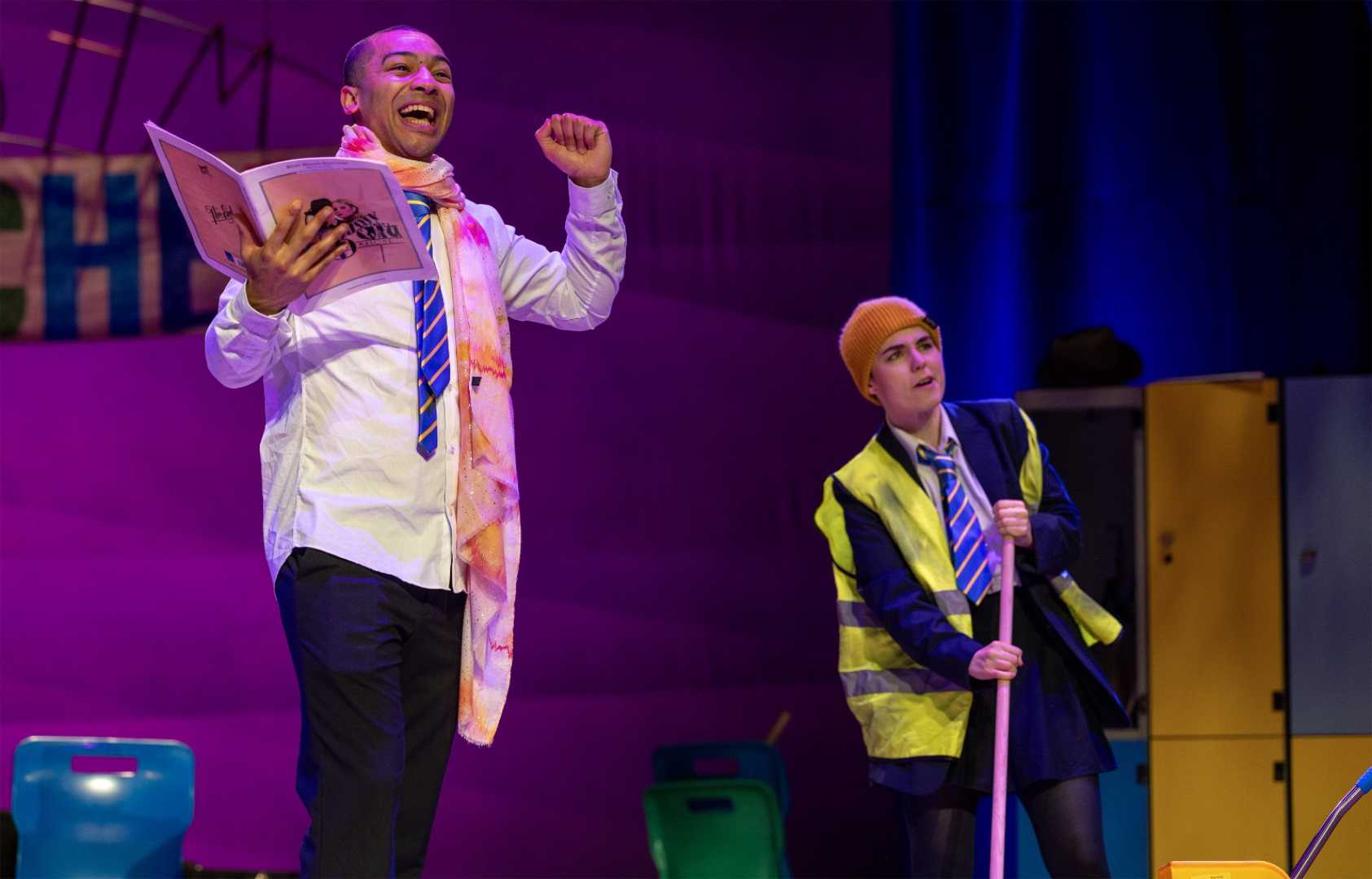 The leadership double-act carries plenty of the satire. Mrs Parry, the executive head, is loud, eccentric and forever spinning plates, and Sophie Suddaby (Hobby) gives her the kind of giddy self-mythologising that turns management into a one-woman show. Dr Basford, the deputy, brings the hard edge of discipline, targets, silence and compliance, and he registers instantly because the production has a brilliant shorthand for him. A mask, a false nose and glasses, and suddenly he’s in the room, petty power made flesh. Jo Patmore (Gail) snaps into that authority with such clean detail that the laugh arrives before the line finishes. It’s a pairing that hands Levi Payne (Salty), Patmore and Suddaby the kind of quick-change terrain that rewards real craft. Between them, they multi-role the school’s power structure at speed, keeping each shift clean enough for the audience to stay with the story. Their clash becomes a running argument about what schools are allowed to become, and who gets to thrive inside them. Add in Oggy Moxon, the bully whose dominance is tolerated through fear and fatigue, and the trio have to keep the power dynamics razor-clear while the pace stays high. With so many characters flying past, the production depends on the trio staying readable in the shared roles and grounded in the three leavers at the heart of the story.